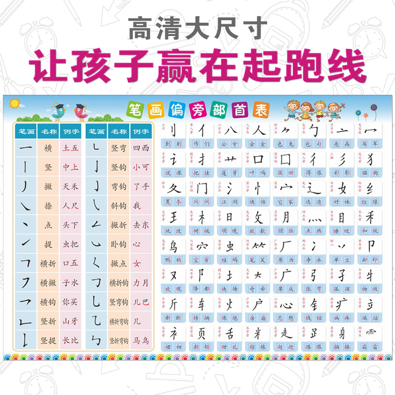 儿童早教启蒙小学生一年级识字表常用笔画偏旁部首墙贴纸海报挂图 Taobao